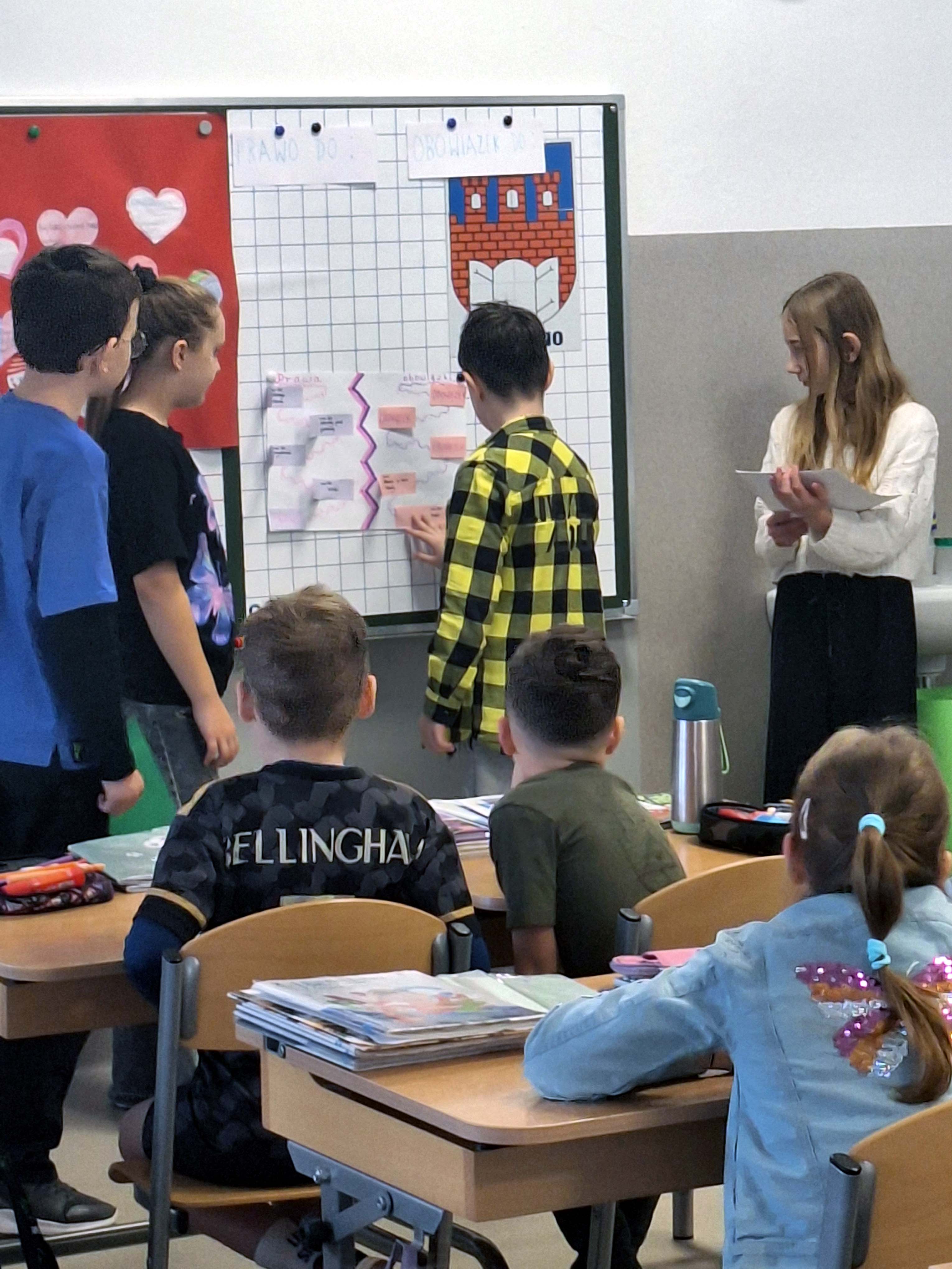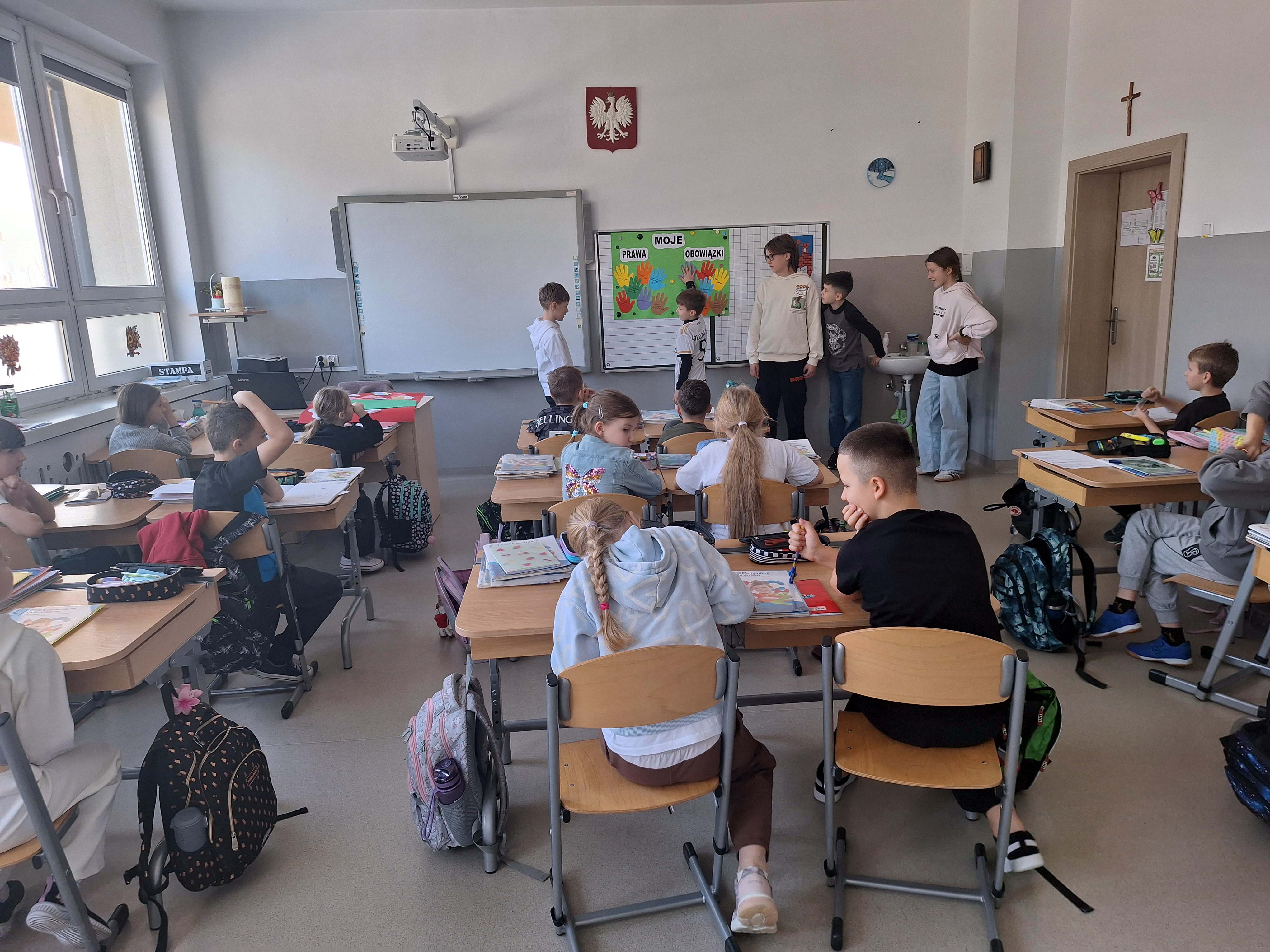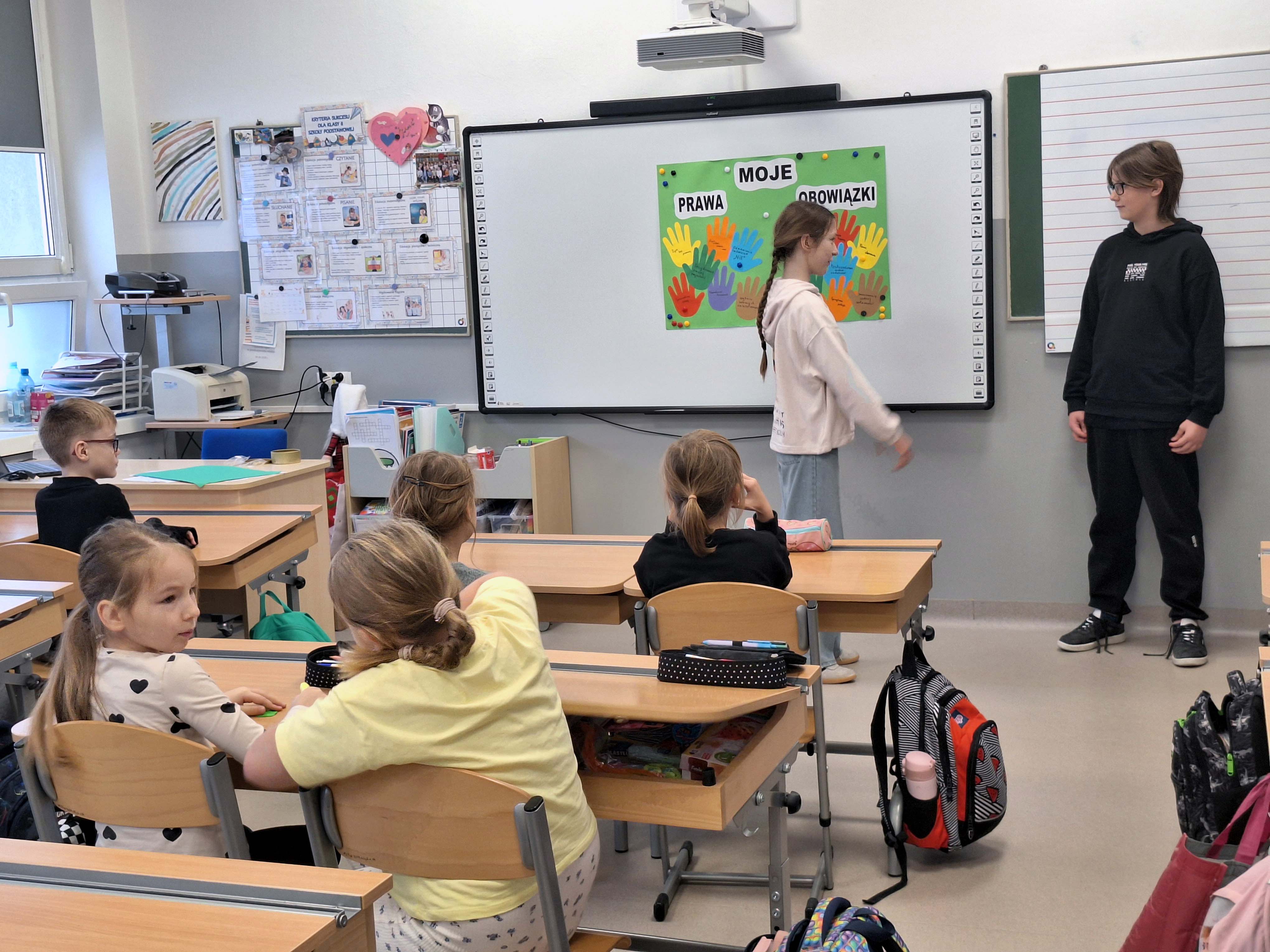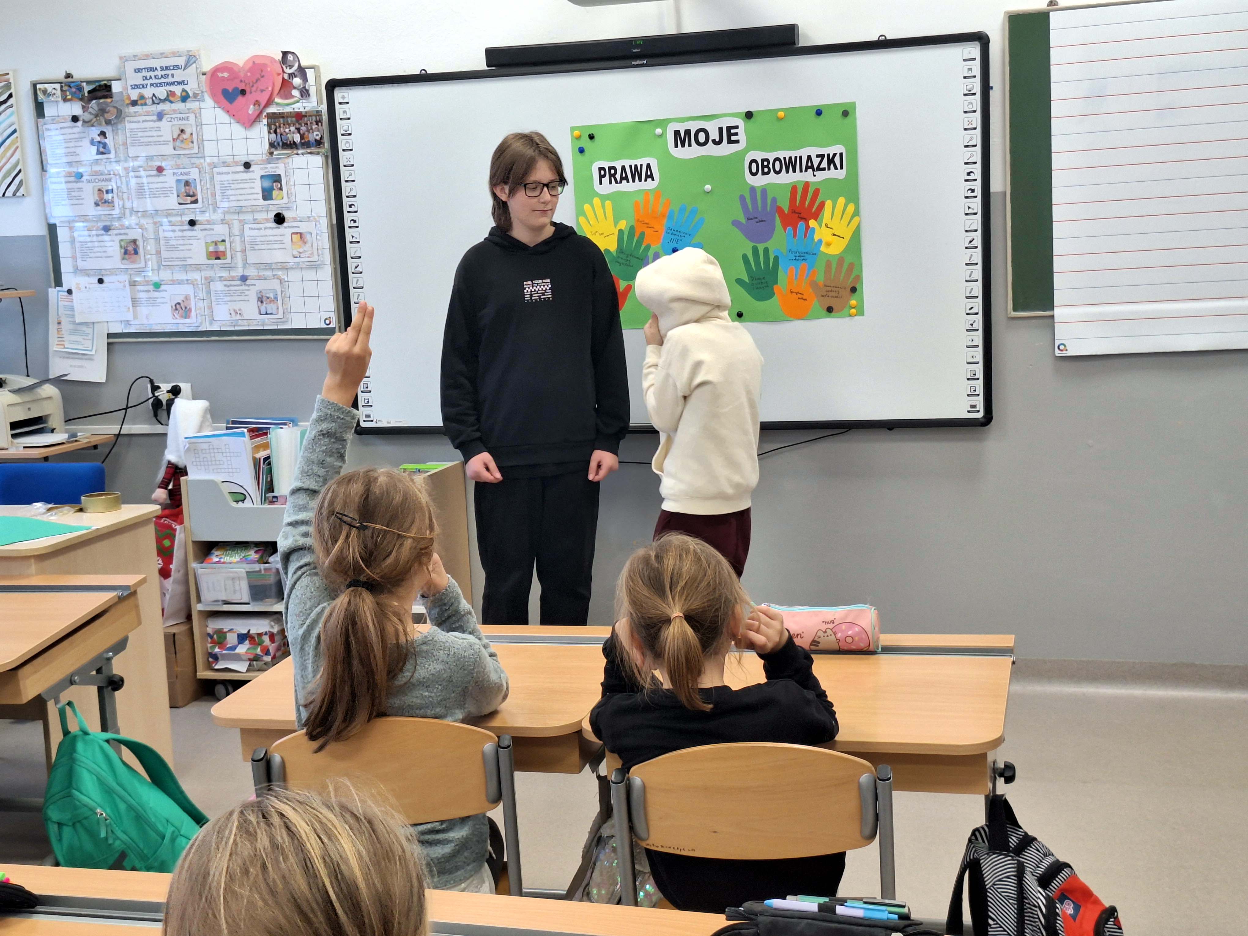 W listopadzie i grudniu uczniowie klasy 5a przeprowadzili zajęcia w klasie 2a i 2b dotyczące praw i obowiązków ucznia. Do zajęć przygotowali się wcześniej wykonując prezentację, plakaty, kalambury oraz quizy. Uczniowie przedstawili swoim młodszym koleżankom i kolegom jakie mają prawa ale również obowiązki zarówno w szkole jak i w domu.