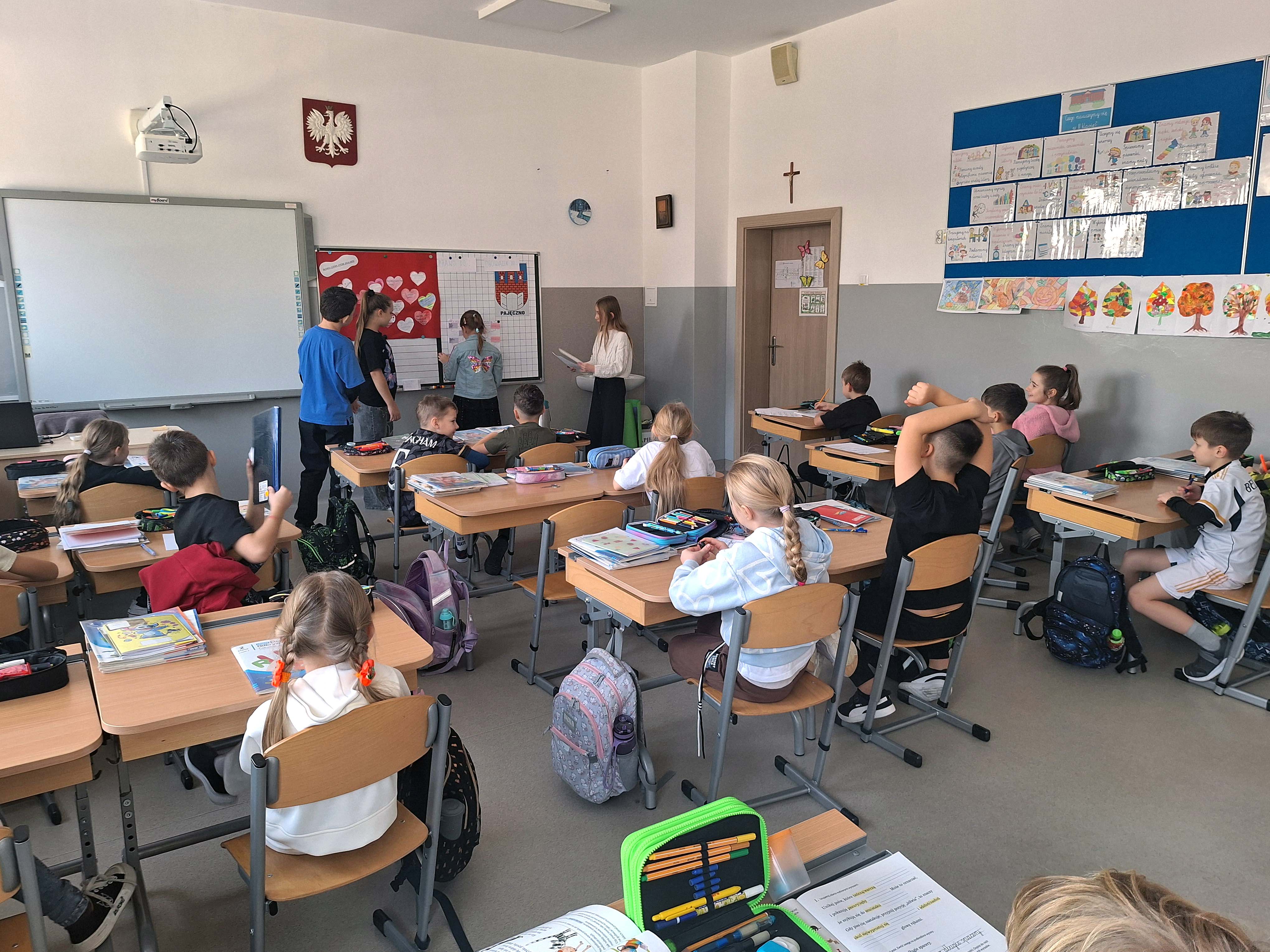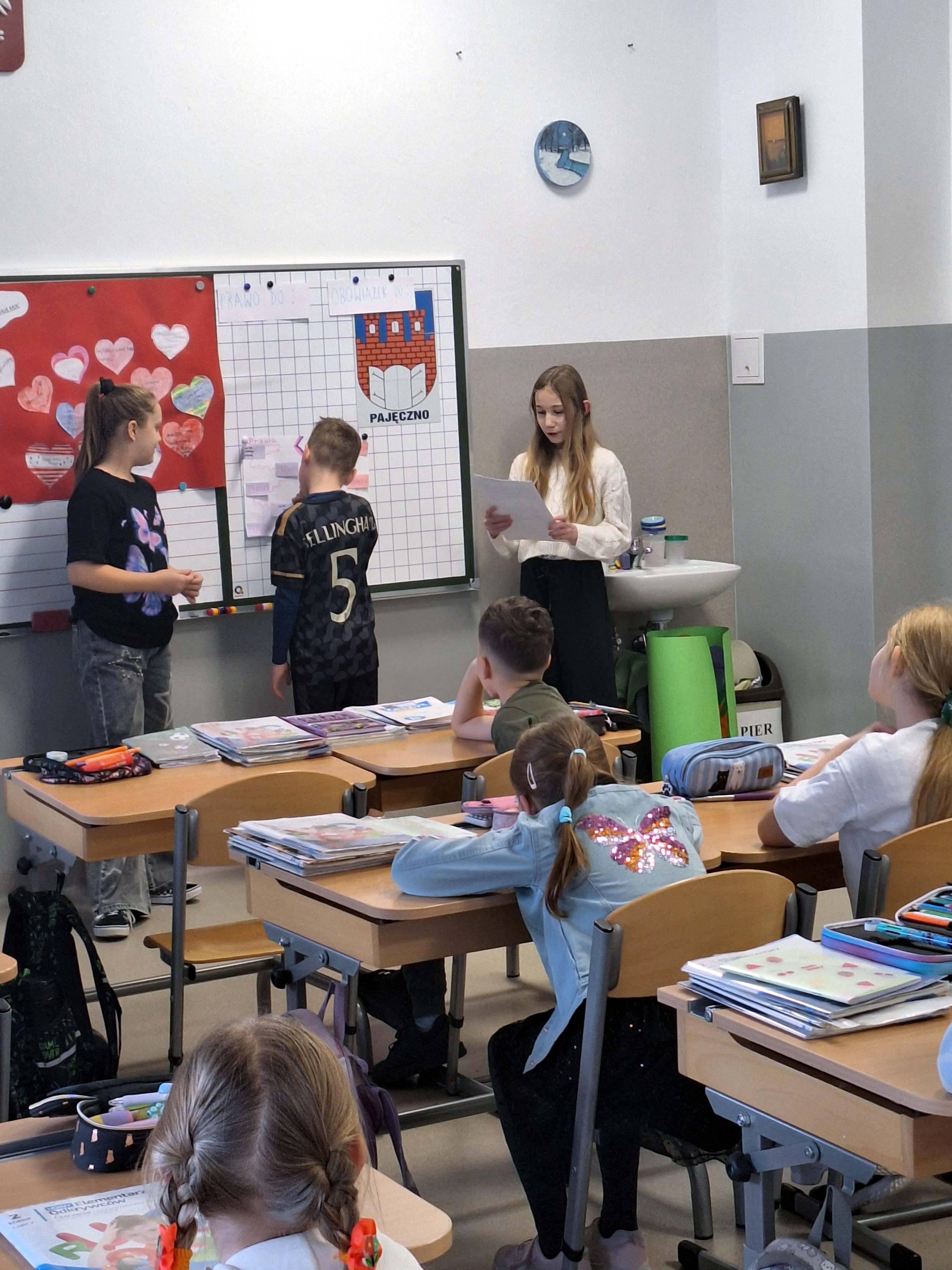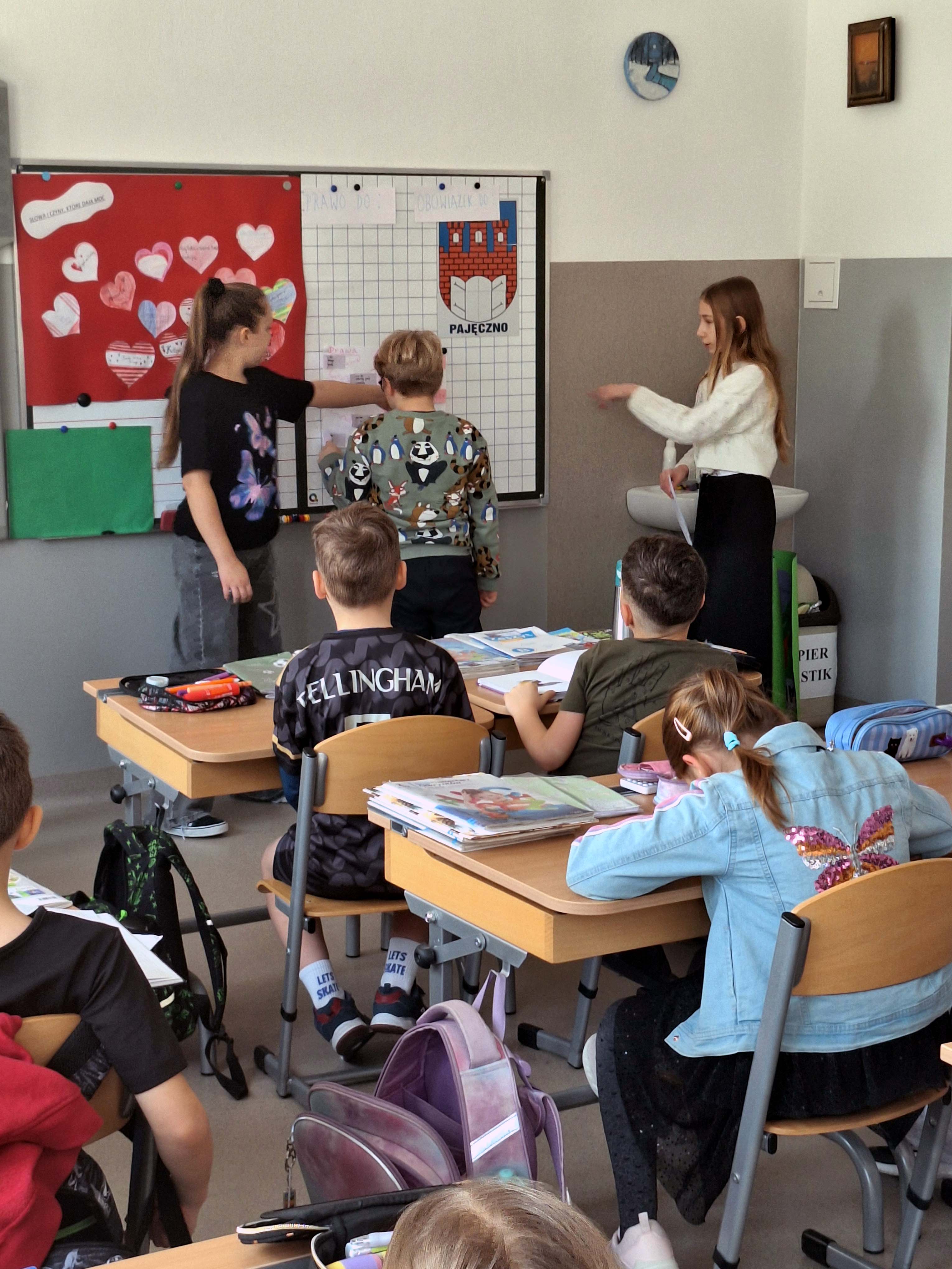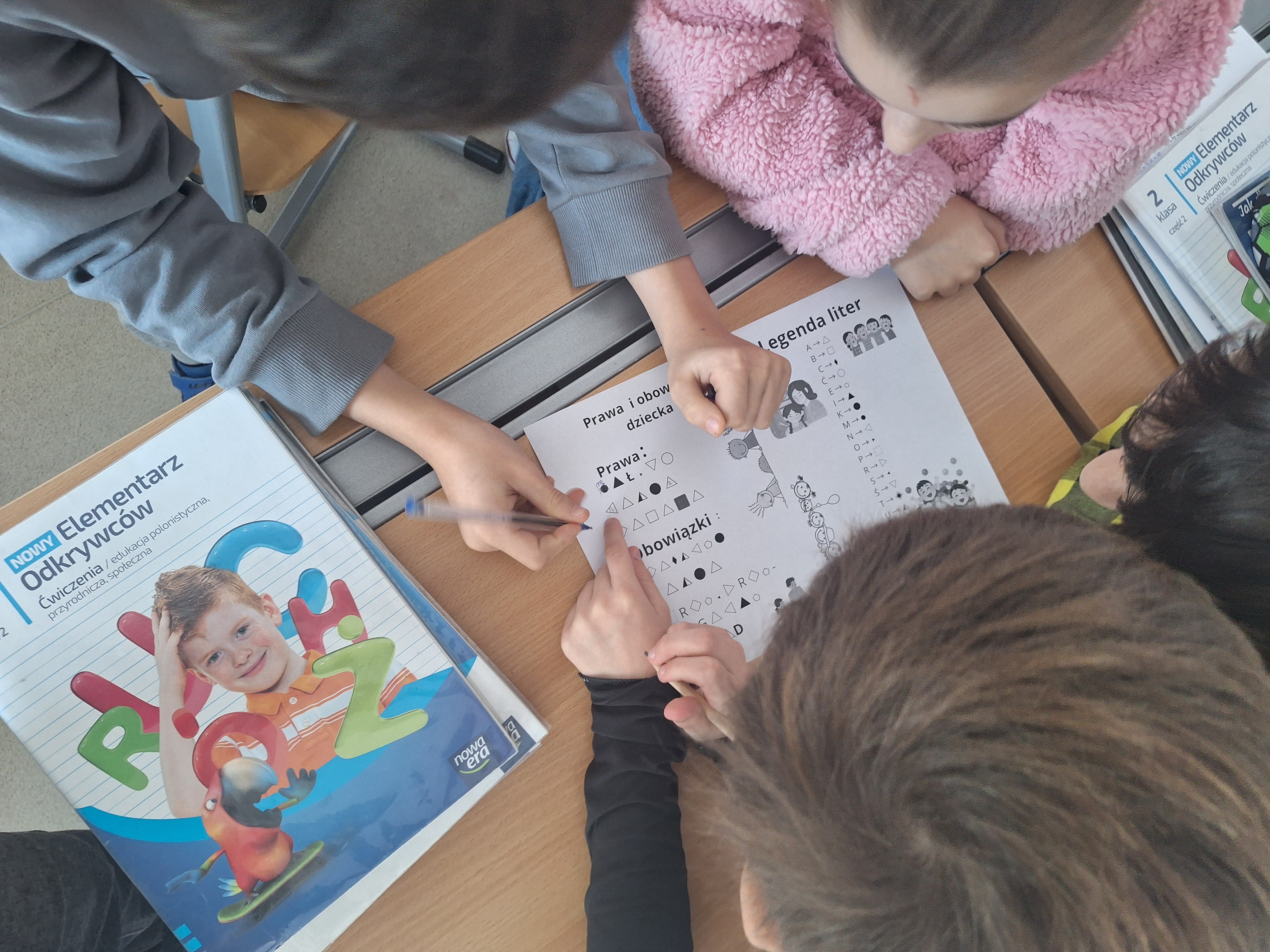W listopadzie i grudniu uczniowie klasy 5a przeprowadzili zajęcia w klasie 2a i 2b dotyczące praw i obowiązków ucznia. Do zajęć przygotowali się wcześniej wykonując prezentację, plakaty, kalambury oraz quizy. Uczniowie przedstawili swoim młodszym koleżankom i kolegom jakie mają prawa ale również obowiązki zarówno w szkole jak i w domu.